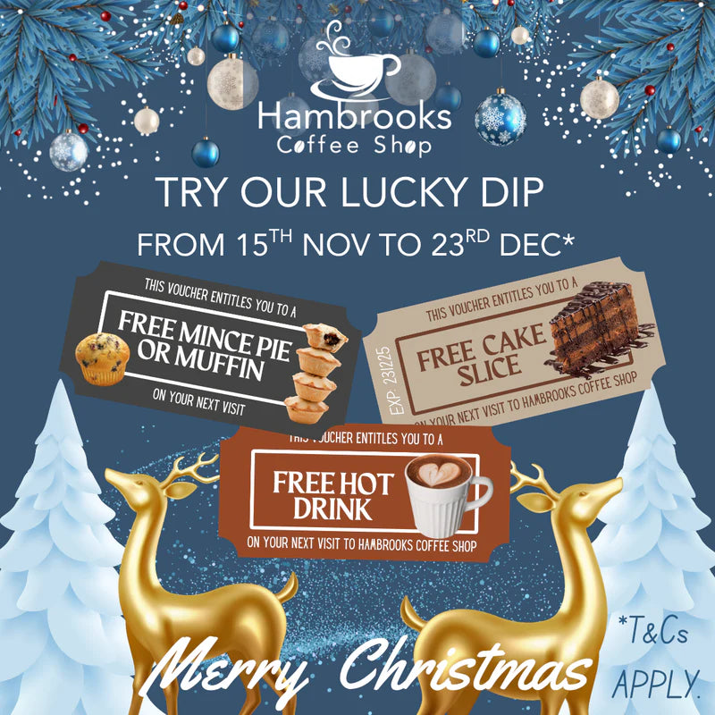 Buy any hot drink with a cake or savoury option and have a go at our Festive Lucky Dip. There are five different voucher prizes to win.