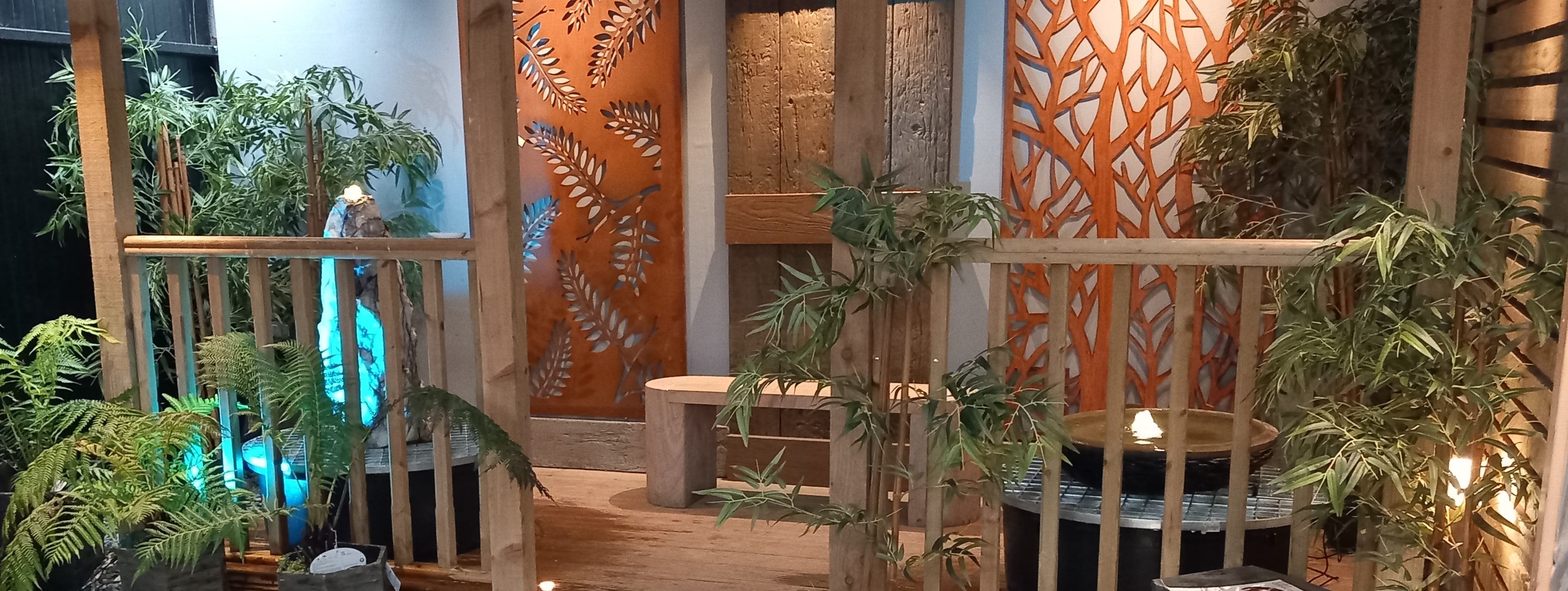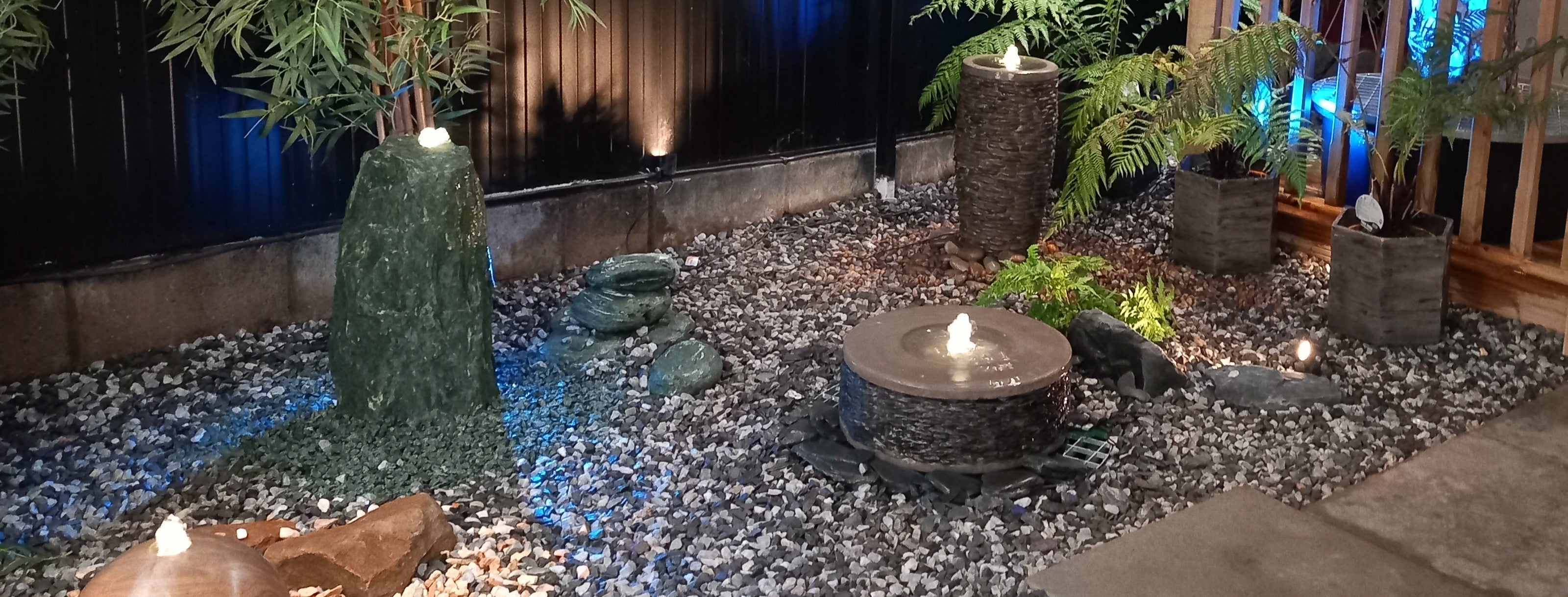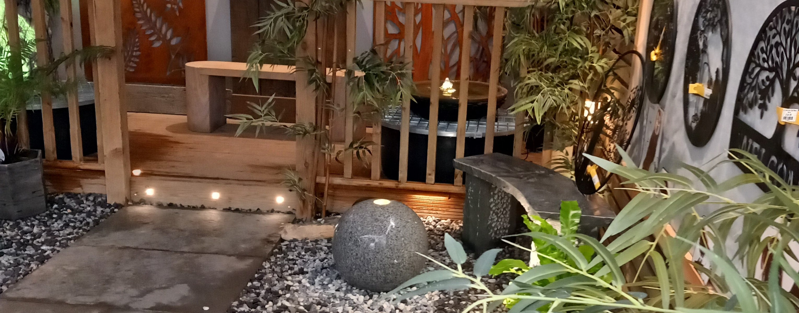 Discover the calming beauty of our Eastern Water Feature Garden, part of our landscaped gardens showcase. Designed to inspire, this space blends natural stone water features, handcrafted stone & granite benches, decorative metal wall art, cobbles, and ambient lighting - showing how these elements can transform your own garden especially at night.