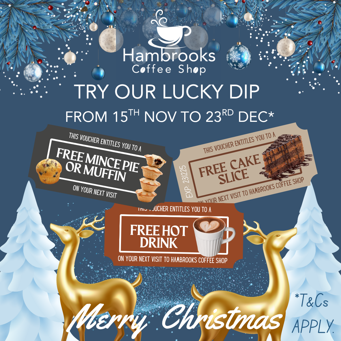 Every time you purchase a hot drink & a slice of cake or something savoury, try your luck in our Festive Lucky Dip! 🎉
